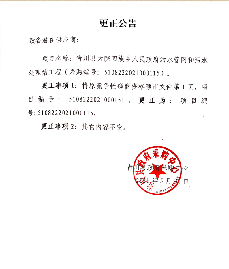 [競爭性磋商]青川縣大院回族鄉(xiāng)污水管網和污水處理站工程[變更公告]