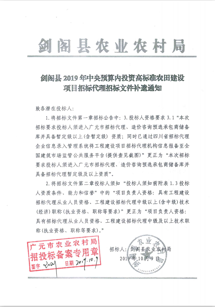 [招標(biāo)代理]劍閣縣2019年中央預(yù)算內(nèi)投資高標(biāo)準(zhǔn)農(nóng)田建設(shè)項目(招標(biāo)代理)補遺