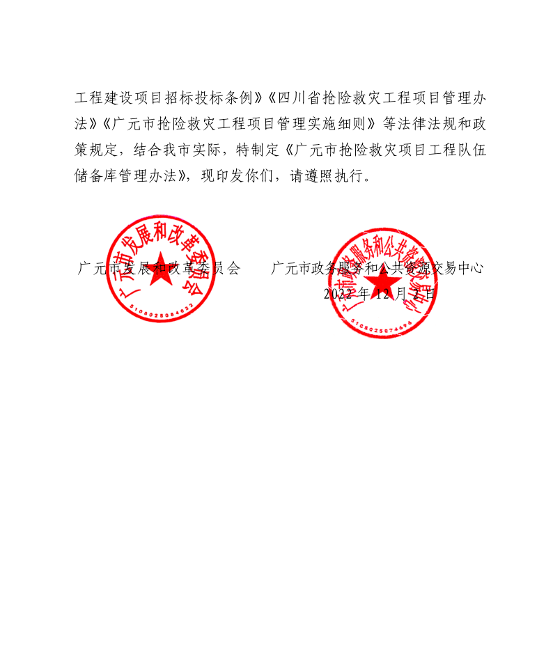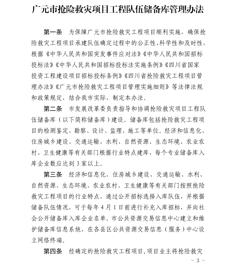 關(guān)于印發(fā)《廣元市搶險(xiǎn)救災(zāi)項(xiàng)目工程隊(duì)伍儲(chǔ)備庫(kù)管理辦法》的通知