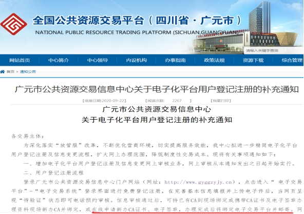 《廣元市公共資源交易信息中心關(guān)于電子化平臺用戶登記注冊的補(bǔ)充通知》