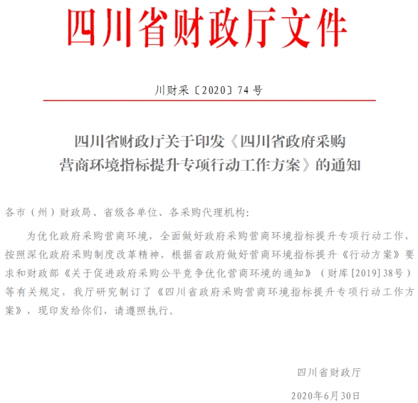 (2)《四川省財政廳關(guān)于印發(fā)<四川省政府采購營商環(huán)境指標(biāo)提升專項行動工作方案>的通知》(川財采〔2020〕74號)