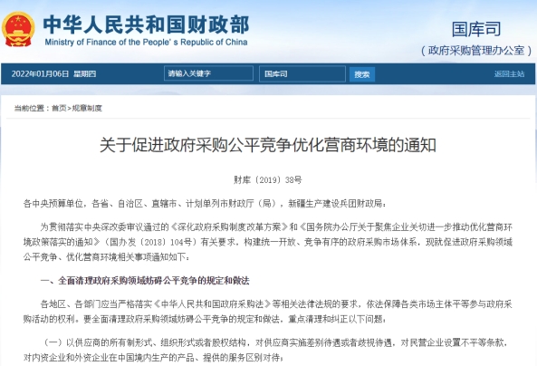 (1)《財政部關(guān)于促進(jìn)政府采購公平競爭優(yōu)化營商環(huán)境的通知》(財庫〔2019〕38號)